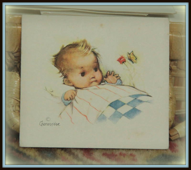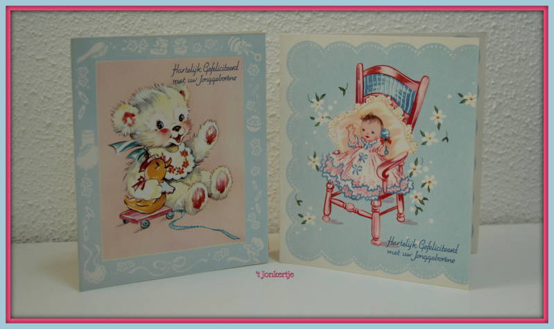Deze felicitatie kaartjes stuurde men als reactie op een ontvangen geboortekaartje, in de jaren '50.
