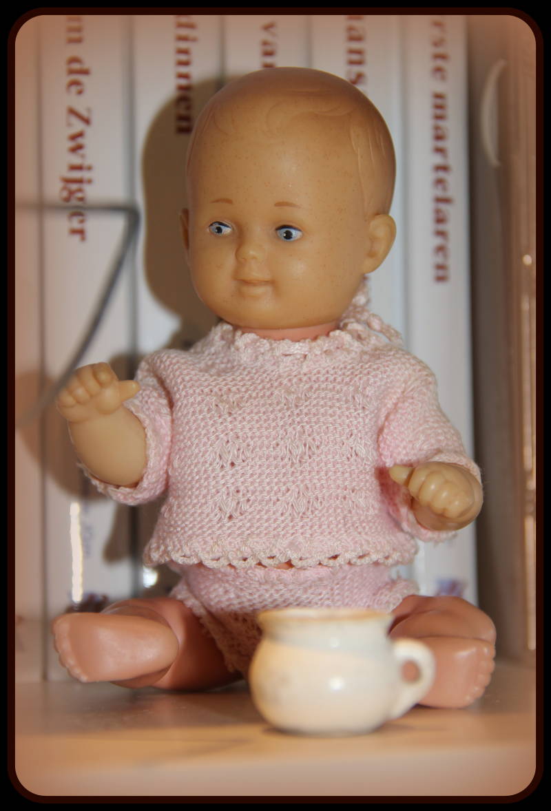 Ze heeft een celluloid rammelaar vast.