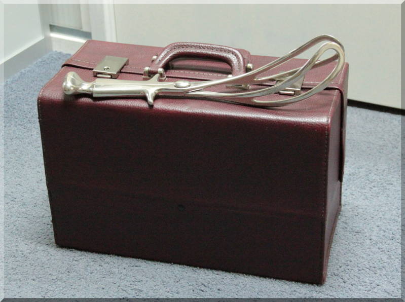 Een kraamverzorgsterskoffer met een originele verlostang.