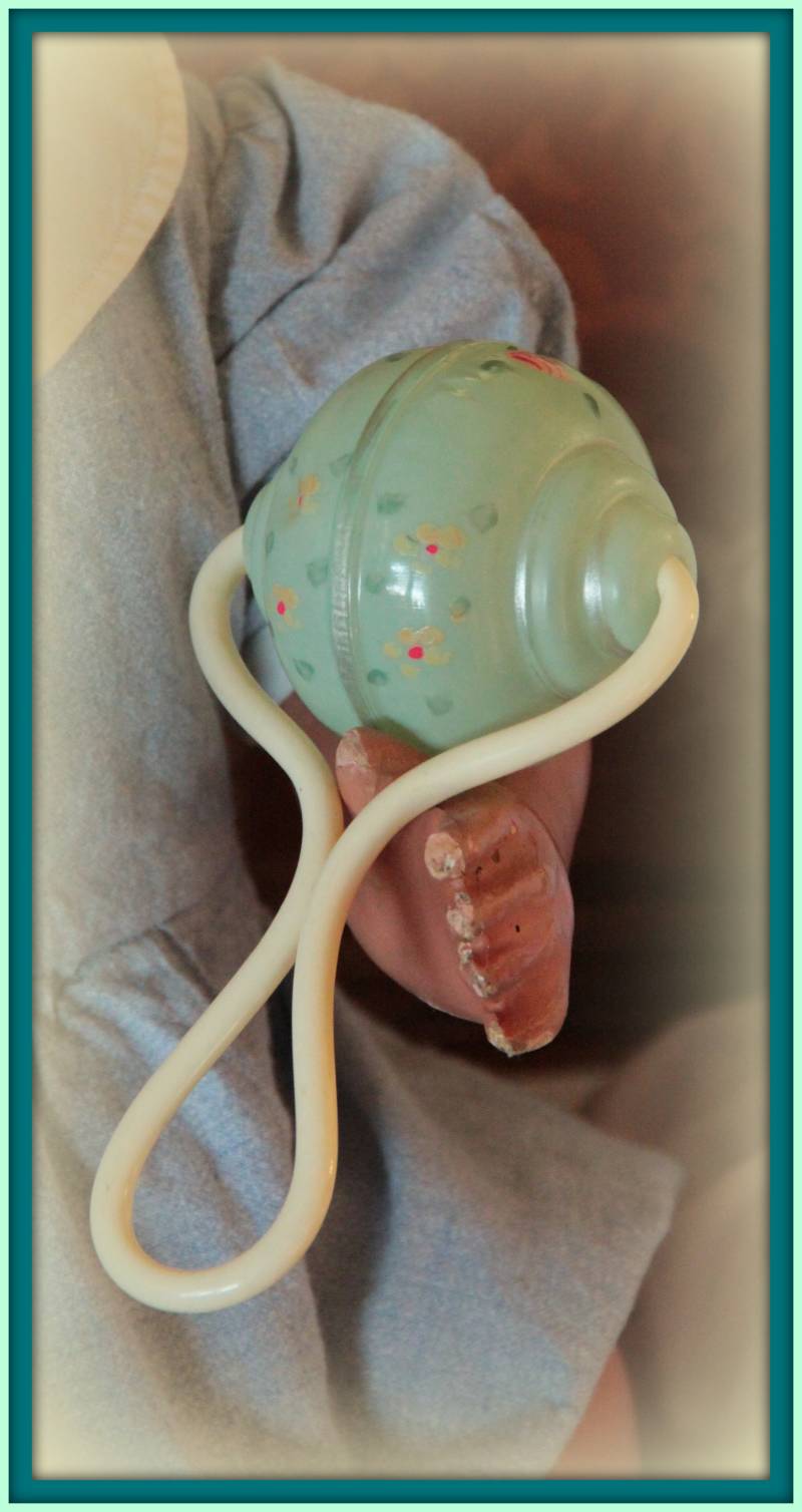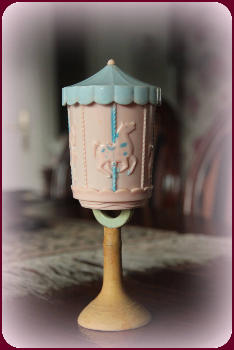 Een rammelaar in de vorm van een caroussel. Deze kun je met een zuignap op de kinderstoel vastmaken.